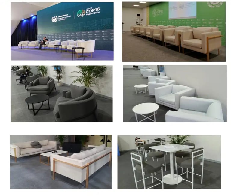 Event furniture rental is far more than a simple logistical task of providing places to sit and surfaces to use. It is a strategic discipline that integrates form and function to achieve specific event objectives. For a corporate event furniture setup, this means creating environments that encourage networking, focus, and productivity. For a wedding furniture rental scheme, it involves curating a romantic and personalized atmosphere that reflects the couple's unique story. For any party furniture hire, the goal is to cultivate a specific vibe, be it sleek and modern or relaxed and bohemian.The case of COP16 exemplifies this perfectly. Outscene Global and GL Events were tasked not just with furnishing a conference, but with creating a microcosm of global environmental discourse. The furniture needed to be durable for back-to-back meetings, luxurious enough to host world leaders, versatile for various session formats, and aesthetically cohesive with the event's sustainability themes. This required a world-class furniture hire Saudi Arabia solution, capable of scaling to immense proportions without compromising on quality or detail.